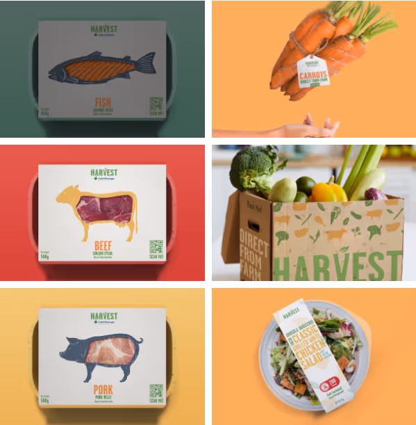 The packaging concept is to have a minimal look while being sustainable in the materials used. A minimal and modern look with simple, stamp-like illustrations and patterns is used to dress the plantable and recyclable packaging. Vegeables such as carrots are packaged minimally with a jute string and a plantable lable. Poultry uses a cutout style to reveal the meat textures, which also adds another layer to the illustrations. The bright and fresh packaging style combines all the elements of HARVEST into a visually engaging experience.